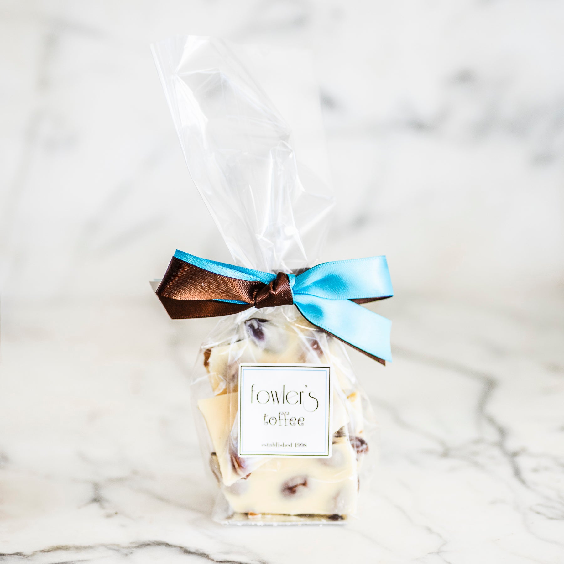 1/4 Pound Toffee Taster: Clear cellophane packaging accented with colorful raffia—perfect for sampling or small gifts.