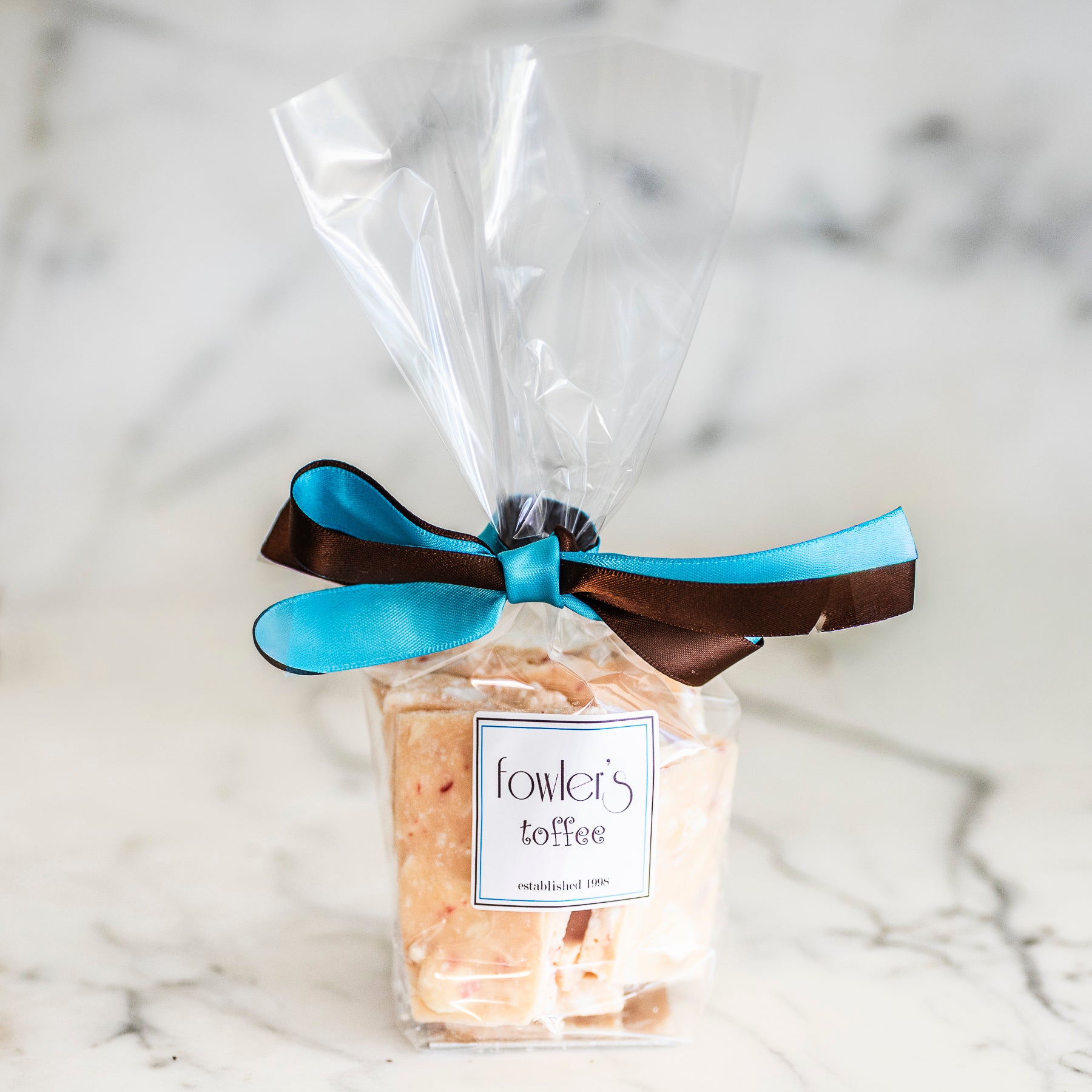 1/4 Pound Toffee Taster: Clear cellophane packaging accented with colorful raffia—perfect for sampling or small gifts.